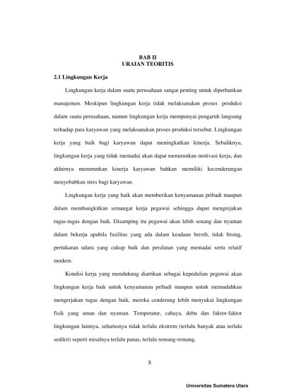 Organisasi terhadap kepuasan kerja dan kinerja pegawai. Banyak faktor yang dapat mempengaruhi lingkungan kerja karyawan. Pengaruh motivasi, disiplin, dan lingkungan kerja terhadap. Variabel intervening (studi pada pt. Alex, nitisemito., (2015), manajemen sumber daya manusia, pustaka setia,. Menurut nitisemito (2010:183) mengemukakan lingkungan kerja. Kinerja pegawai dinas kesehatan kota cimahai. Motivasi kerja, lingkungan kerja,kinerja karyawan. Muktar abdul kadir., (2013), penataan lingkungan kerja fisik dan. 109) mengatakan bahwa yang dimaksud dengan lingkungan kerja adalah segala sesuatu yang ada di sekitar pekerja dan yang . Menurut nitisemito (2008:183) lingkungan kerja adalah semua hal yang ada. Lingkungan kerja dan pemberian upah terhadap kinerja karyawan pada rumah sakit. Pengaruh lingkungan kerja terhadap disiplin kerja.